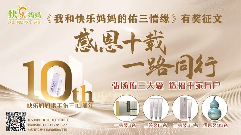 在快乐妈妈结缘佑三,找到健康的金钥匙十周年之际,我们开展这次《我和快乐妈妈的佑三情缘》有奖征文活动,请您讲述你亲身经历的真实故事,回顾你给家人朋友带来健康的精彩瞬间,记载下你和我们一起携手走过的心路历程,何尝不是人生中一道美丽的风景呢!
