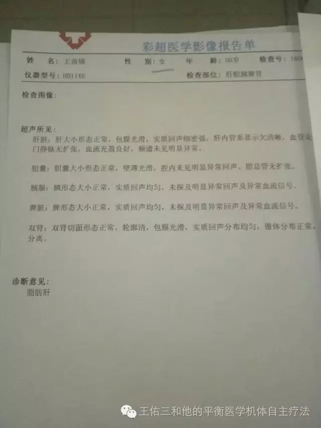 平衡医学真神奇 盆腔积液痊治愈 同时,我们还收到了一位患者治疗前后的检查报告。报告显示:治疗前该患者被诊断为脂肪肝,在经过平衡医学机体自主疗法治疗一段时间以后,报告显示:肝胆胰脾声像图未见明显异常。也就是说该患者的脂肪肝已经治愈了。一个个真实的病例,更加大了我们弘扬平衡医学的决心,我相信每个平衡医学的人都有信仰,大爱无言,大爱无疆!